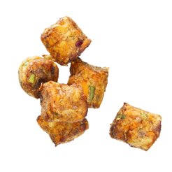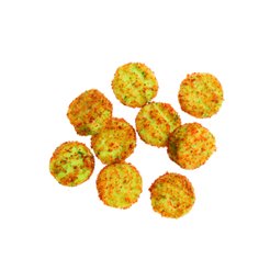 Friterad grönsaksknappar som är tillverkad av potatis, spenat och grynost.