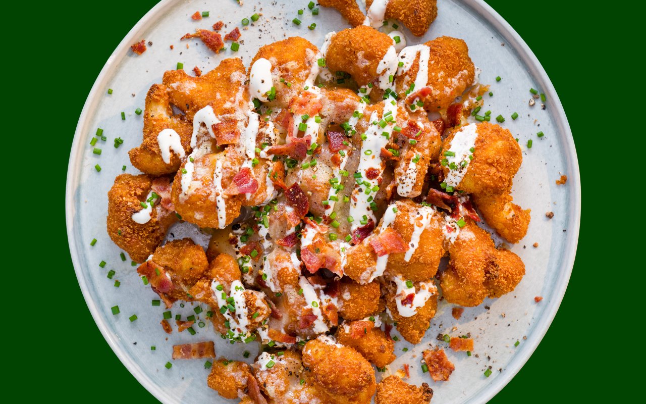 Buffalo blomkålswings toppad med cheddar, bacon och gräddfil